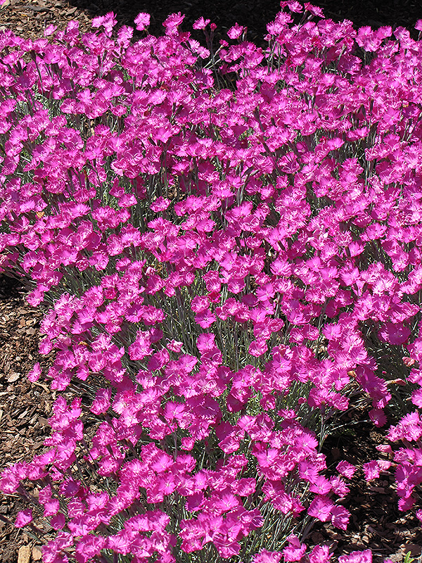 Hardiness Zone: 3a Other Names: Cheddar Pinks, Clove Pinks Description: A robust variety bearing single, fuchsia flowers in late spring to early summer, over a cushion of blue-green, grass-like leaves; has a mild, clove-like, spicy fragrance; will sporadically re-bloom throughout the summer Ornamental Features Firewitch Pinks has masses of beautiful fragrant fuchsia frilly flowers with white eyes at the ends of the stems from late spring to mid summer, which are most effective when planted in groupings. The flowers are excellent for cutting. Its attractive grassy leaves remain silvery blue in color throughout the year. Landscape Attributes Firewitch Pinks is an herbaceous evergreen perennial with a mounded form. It brings an extremely fine and delicate texture to the garden composition and should be used to full effect. This plant will require occasional maintenance and upkeep, and is best cleaned up in early spring before it resumes active growth for the season. It is a good choice for attracting bees and butterflies to your yard, but is not particularly attractive to deer who tend to leave it alone in favor of tastier treats. It has no significant negative characteristics. Firewitch Pinks is recommended for the following landscape applications; Planting & Growing Firewitch Pinks will grow to be only 6 inches tall at maturity extending to 8 inches tall with the flowers, with a spread of 10 inches. When grown in masses or used as a bedding plant, individual plants should be spaced approximately 8 inches apart. Its foliage tends to remain low and dense right to the ground. It grows at a medium rate, and under ideal conditions can be expected to live for approximately 5 years. As an evegreen perennial, this plant will typically keep its form and foliage year-round. This plant should only be grown in full sunlight. It prefers to grow in average to moist conditions, and shouldn't be allowed to dry out. It is not particular as to soil type or pH. It is highly tolerant of urban pollution and will even thrive in inner city environments. This is a selected variety of a species not originally from North America. It can be propagated by cuttings; however, as a cultivated variety, be aware that it may be subject to certain restrictions or prohibitions on propagation. Firewitch Pinks is a fine choice for the garden, but it is also a good selection for planting in outdoor pots and containers. It is often used as a 'filler' in the 'spiller-thriller-filler' container combination, providing a mass of flowers and foliage against which the thriller plants stand out. Note that when growing plants in outdoor containers and baskets, they may require more frequent waterings than they would in the yard or garden.![]()